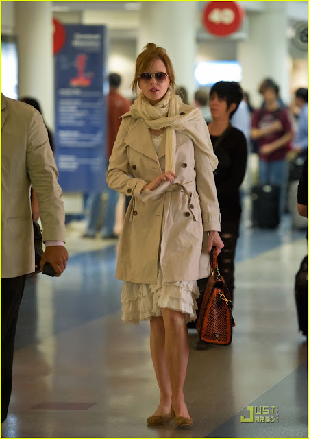 Nicole Kidman no aeroporto investiu nas roupas em apenas um tom, eu achei lindo o casaco, e o vestido de renda, pena que ela não tirou o casaco pra gente ver melhor os detalhes do vestido, acho q só o sapato poderia mudar né?