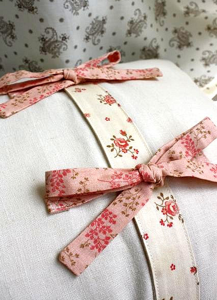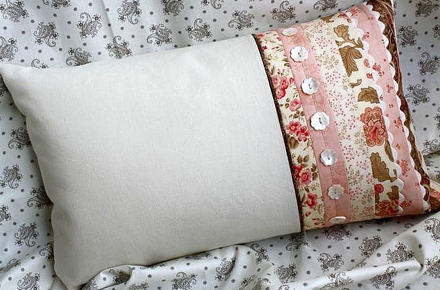 Tiras de tecidos, botões, laçarotes...ahh se eu tivesse mais horas no dia e algum talento, acho que passaria horas experimentando tecidos e acabamentos e teria muitas almofadas como esta.