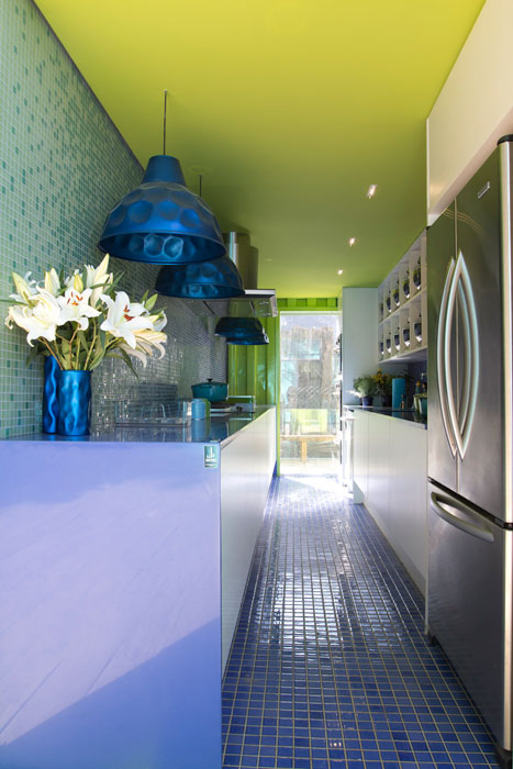 A cozinha da casa conteiner projetada por Brunete Fraccaroli, na Casa Cor deste ano, recebeu uma cor cítrica, que iluminou e contrastou com os tons de azuis presentes no restante do ambiente.