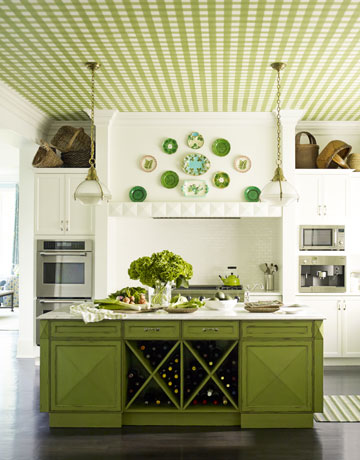 Papel de parede xadrez no forro, nos mesmos tons existentes no resto do ambiente. Observe que o ambiente é amplo, bem iluminado e tem muito branco na mobília.