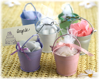Os pequenos baldes de alumínio coloridos são versáteis, servem para guardar docinhos, amêndoas confeitadas, mini-sabonetes, etc.