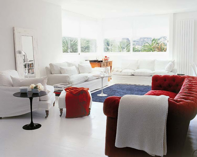 Vamos fzer uma visitinha a essa casa que eu encontrei no site da Revista Micasa? Ela me intrigou, pois tem elementos muito refinados dentro de uma decoração que é bem simples, bem clara, sem exageros. Alguns elementos são de morreeeeeer de tão lindos, como o sofá vermelho Chesterfield, o espelho do quarto, os móveis de designers famosos, mas o que impera aqui é a base branca, simples e de linhas retas.